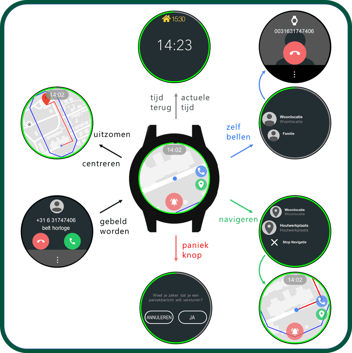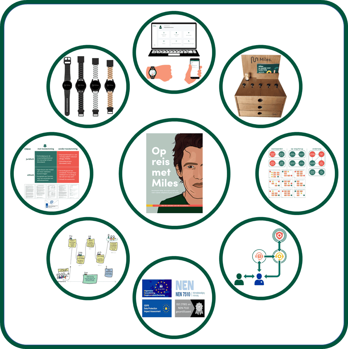 Miles is meer dan een horloge – het is een slimme combinatie van technologie en zorg. Via een desktopapp stellen zorgverleners afspraken in, het zorghorloge begeleidt de cliënt onderweg, en bij onregelmatigheden ontvangen zorgverleners automatisch een melding via de smartphone app. Zo wordt zelfstandigheid veilig mogelijk gemaakt.