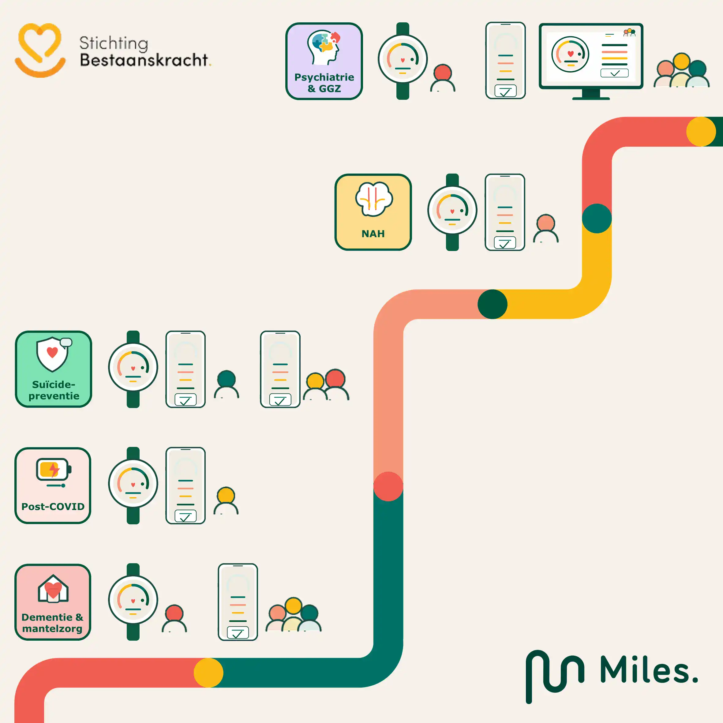 Na aandacht hierover in landelijke media kwam al snel een nieuwe vraag op tafel. Families, zorgverleners en instellingen vroegen of dezelfde aanpak ook voor andere doelgroepen iets kon betekenen. De stichting koos er bewust niet voor om het Miles zorghorloge zomaar op andere groepen toe te passen. Eerst moest duidelijk worden wat elke doelgroep echt nodig heeft. Zo ontstond de aanpak Miles op maat, waarbij mensen met een bepaalde aandoening en problematiek centraal staan en zorgverleners en naasten worden berokken.